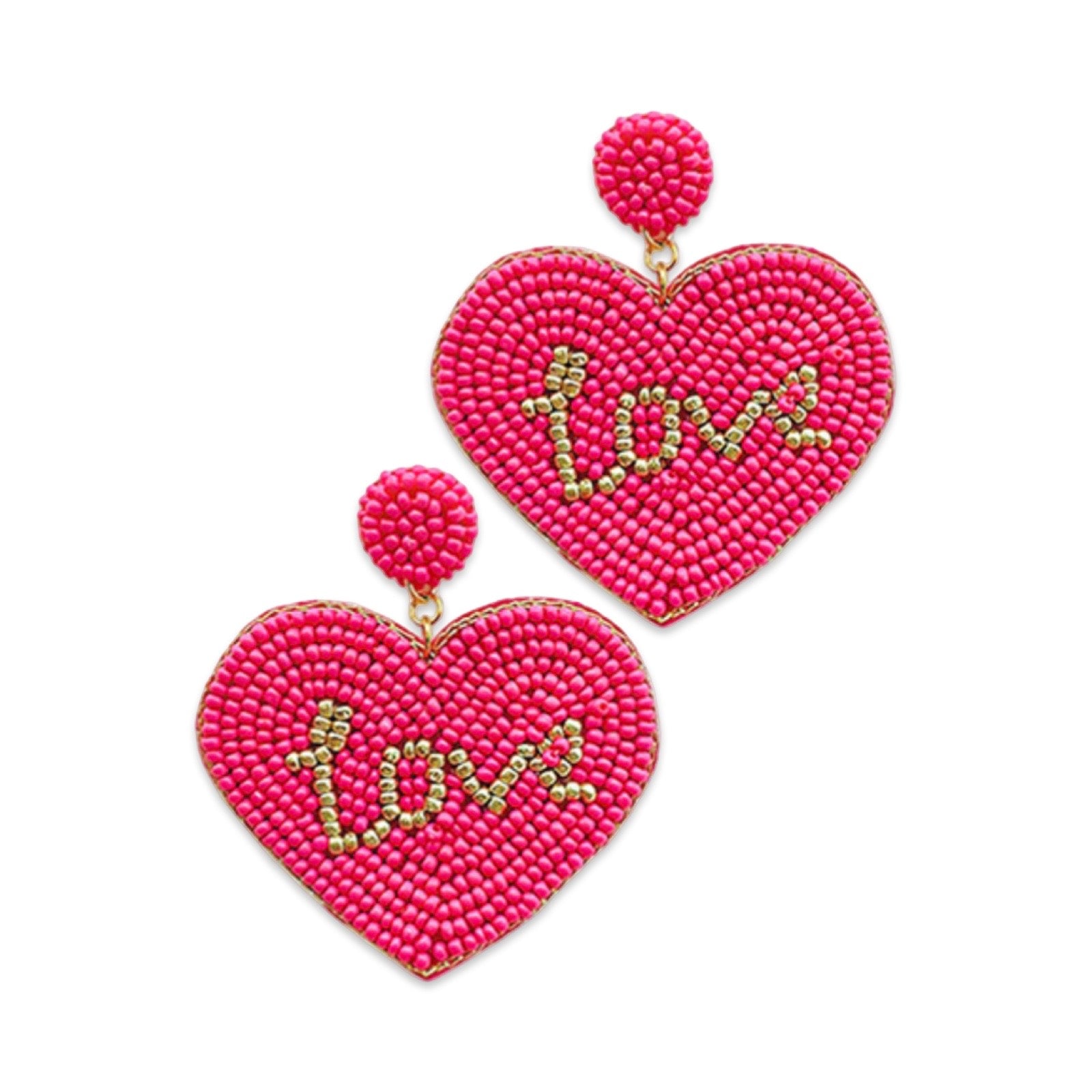 Pink Beaded LOVE Heart Earrings | Valentine's Earrings